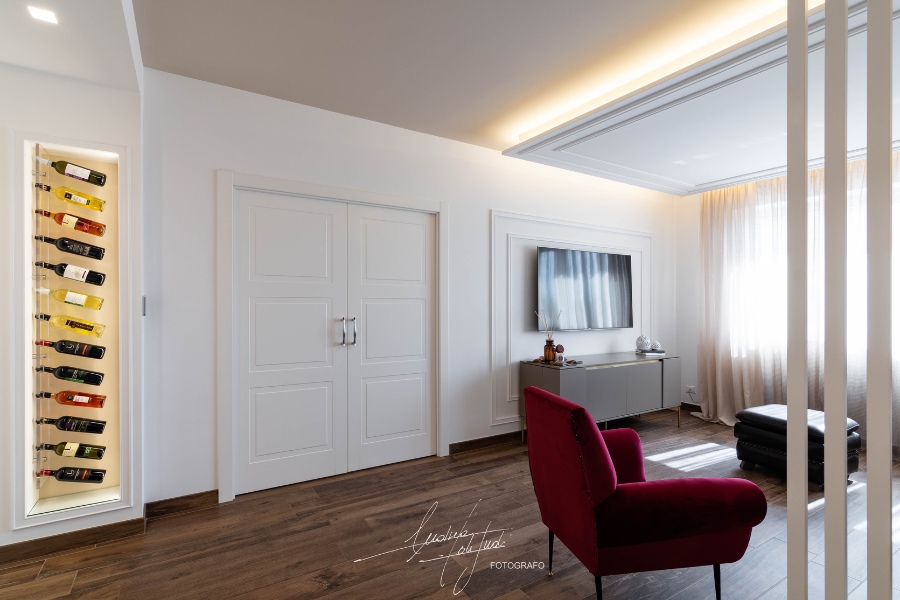 Una vineria illuminata, con veletta in cartongesso, oltre ad impreziosire l’ambiente, è servita a celare il pilastro originariamente lasciato a vista.