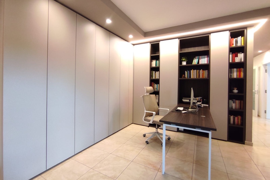 Nel nostro caso, la prima esigenza è stata migliorare la funzionalità della stanza, senza trascurarne la capacità di accoglienza. La scrivania è stata inglobata in un arredo angolare, in cui il susseguirsi di elementi aperti e chiusi, hanno conferito allo studio un aumentata capacità contenitiva degli spazi, destinati a libri, oppure oggetti utili allo svolgimento delle attività previste.